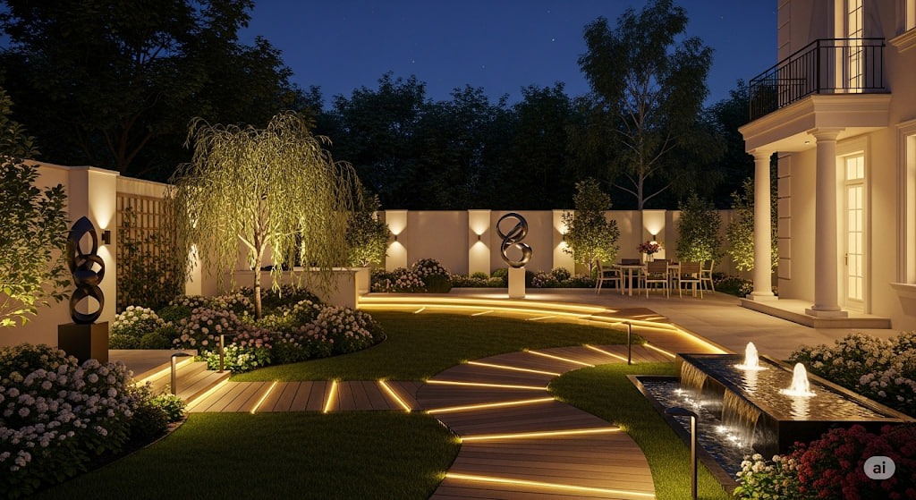 Những điểm nhấn như cây cảnh, hồ nước hoặc mặt tiền nhà sẽ trở nên nổi bật hơn khi được chiếu sáng hợp lý.